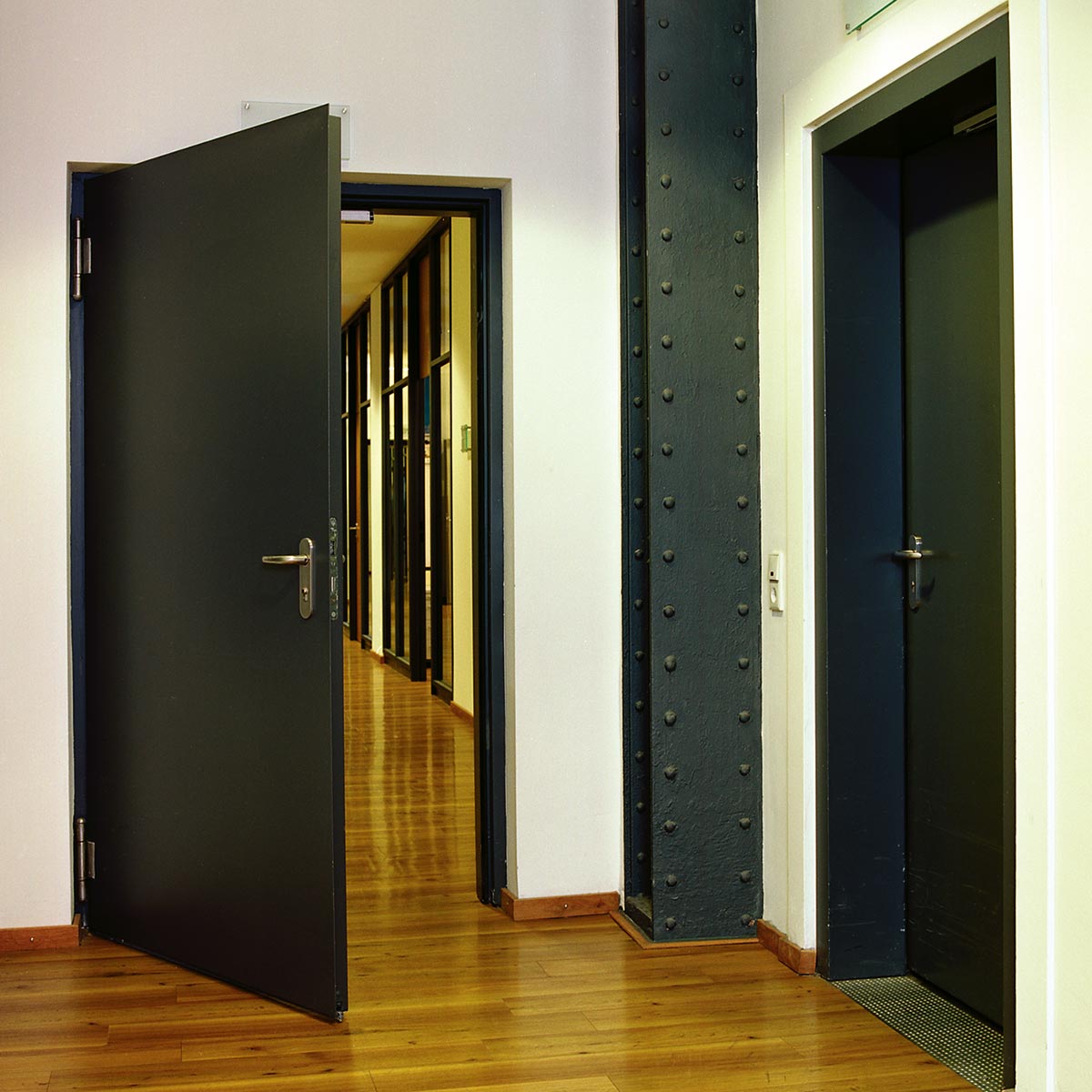 Unter Mehrzwecktüren werden Stahltüren für den Einsatz im Innen- und Außenbereich zusammengefasst. Sie können ein- oder mehrflügelig ausgeführt sein. Zu einer Multifunktionstür werden unsere Spezialtüren, wenn mehrfache Schutzfunktionen wie Einbruchhemmung, Schallschutz, Wärmeschutz etc. hinzukommen. Schildern Sie uns Ihre Anforderung und wir realisieren aus dem perfekten Mix an Verglasung, Lüftungsgitter, Beschlägen und Blechstärke die perfekte Tür. Selbst XXL-Formate sind möglich.